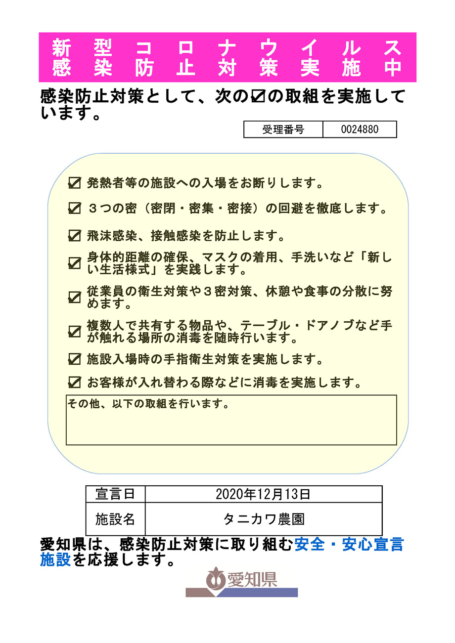 【生産者側(いちご狩り農家)の取り組み事項】 各エントランスには手指アルコール消毒液を設置します。 スタッフへの検温の実施とマスク等の着用を徹底します。 飛沫防止シート(パーテーション)を設置します。 受付場所・直売所内に人との間隔を空けるためのラインまたは、目印を設置します。 会計は、トレイでの受け渡しとします。 直売所やビニールハウスの定期的な換気に換気に努めます。 感染防止対策実施をPRするステッカーやポスターを掲示します。 施設内の清掃・除菌をこまめに実施します。